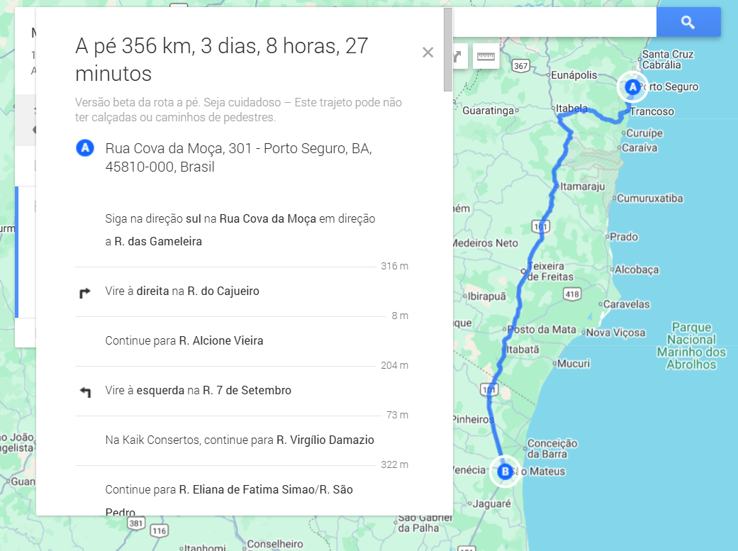 Se considerarmos isso, as 5 léguas entre Porto Seguro e a Aldeia de São Mateus seria equivalente a 30 quilômetros de distância, um número muitas vezes menor do que a distância real entre Porto Seguro e a cidade de São Mateus, que é mais de 350 quilômetros, como dá para ver na imagem abaixo: