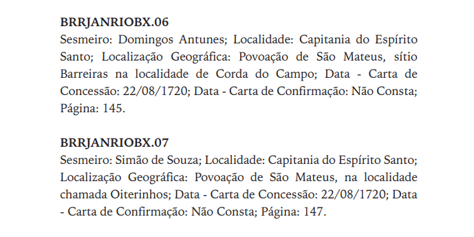 Há dois registros de doações de sesmarias em São Mateus, ambos de 1720.