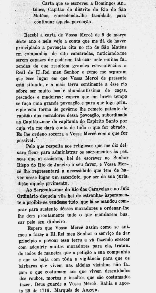 Existe uma carta de 1716 assinada pelo Marquês de Angeja, 3º vice-rei do Brasil e vice-rei da Índia Portuguesa, que menciona uma carta recebida por ele em 9 de março de 1716. Esta teria sido descrita por Domingos Antunes, que teria iniciado um povoamento no Rio de São Mateus com mais 8 homens, como é possível ver abaixo: