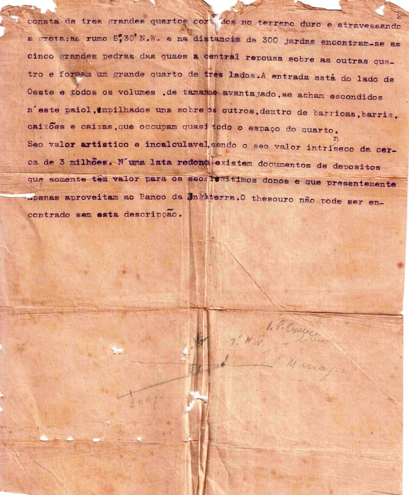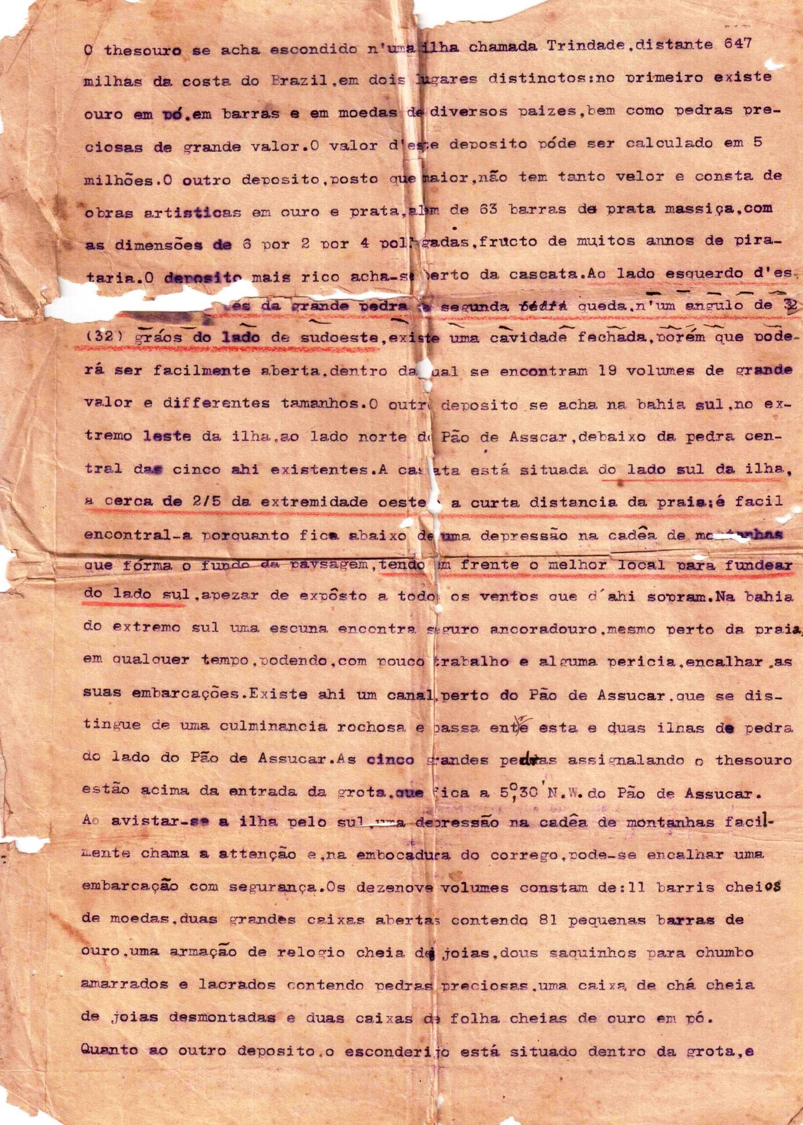 O tesouro está escondido numa ilha chamada Trindade a 647 milhas da costa do Brasil, em 2 lugares distintos: no primeiro existe ouro em pó, em barras, em moedas de diversos países, bem como pedras preciosas de grande valor. O valor deste depósito pode ser calculado em 5 milhões de libras. O outro depósito, posto que maior, não tem tanto valor e consta de obras artísticas em ouro e prata, além de 63 barras de prata maciça, com as dimensões de 6x2x4 polegadas, fruto de muitos anos de pirataria. O depósito mais rico acha-se perto da cascata. Ao lado esquerdo desta, distante 3 pés da grande pedra, a segunda pedra fica num ângulo de 32 ao lado do sudoeste, existe uma cavidade fechada, porém, que poderá ser facilmente aberta, dentro da qual se encontram 19 volumes de grande valor e diferentes tamanhos. Outro depósito se acha na baía sul, no extremo leste da ilha ao lado norte do pão de açúcar, debaixo da pedra central das 5 aí existentes. A cascata está situada ao lado sul da ilha, a cerca de 2,5 da extremidade Oeste a curta distância da praia. É fácil encontrá-la porquanto fica abaixo de uma depressão na cadeia de montanhas que formam o fundo da paisagem, tendo em frente o melhor local para fundear ao lado sul, apesar de exposto a todos os ventos que daí sopram. Na baía do extremo Sul, uma escuna encontra seguro ancoradouro, mesmo perto da praia, em qualquer tempo, podendo com pouco trabalho e alguma perícia, encalhar as suas embarcações. Existe aí um canal perto do pão de açúcar, que se distingue de uma culminância rochosa que passa entre esta e 2 ilhas de pedras do lado do pão de açúcar. Há 5 grandes pedras assinalando o tesouro que estão acima da entrada da gruta, que fica a 5 graus e 30 minutos a noroeste do pão de açúcar. Ao avistar-se a ilha do Sul uma depressão na cadeia de montanhas facilmente chama a atenção e, na embocadura do córrego, pode-se encalhar uma embarcação com segurança. Os 19 volumes constam de: 11 barris cheios de moedas, 2 grandes caixas abertas contendo 81 pequenas barras de ouro, 1 armação de relógio cheia de jóias, 12 saquinhos para chumbo amarrados e lacrados contendo pedras preciosas, 1 caixa de chá cheia de jóias desmontadas e 2 caixas de folhas cheias de ouro em pó. Quanto ao outro depósito o esconderijo está situado dentro da grota, e consta de 3 grandes quartos cortados no terreno duro e atravessando a grota; ao rumo de 5 graus e 30 minutos a noroeste e na distância de 300 jardas encontram-se as 5 pedras, das quais a central repousa sobre as outras 4 e formam um quarto de 3 lados. A entrada está do lado oeste e todos os volumes de tamanho avantajado, se acham escondidos nesse paiol, empilhados uns sobre os outros dentro de barricas, barris, caixas e caixões, que ocupam quase todo o espaço do quarto. Seu valor artístico é incalculável, sendo seu valor intrínseco de cerca de 3.000.000 de libras. Numa lata redonda existem documentos de depósitos que somente têm valor para os seus legítimos donos e que presentemente aproveitam ao Banco da Inglaterra. O tesouro não será encontrado sem esta descrição.