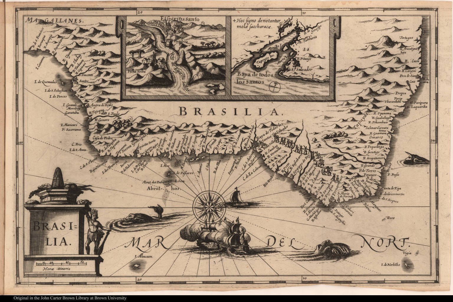 Mapa da costa leste do Brasil com o norte para a direita. Elementos cartográficos incluem escala, rosa dos ventos, graus de latitude e longitude, nomes de rios e assentamentos. Inclui peixes e barcos. Inclui inserções de vistas aéreas [vistas de pássaro] do Espiritu Santo e mapa da Baya de todos los Santos no atual estado da Bahia. Cartucho inclui pães de açúcar e homem nativo Americano segurando remo e vestindo cocar e saia de penas. Inclui também soldados e grupo de mulas próximo a Pernambuco[3].