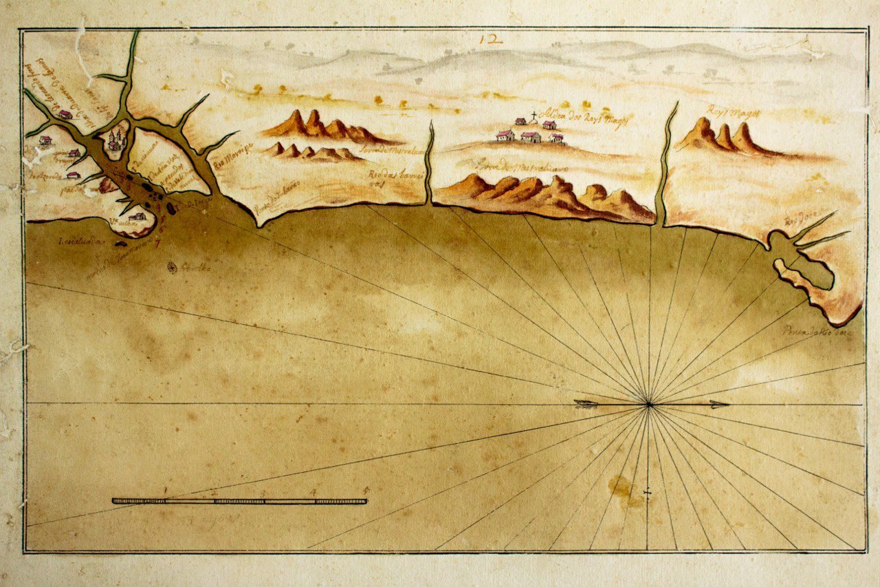 A aldeia jesuítica dos Reis Magos aparece no interior do mapa, atrás da serra. Nos mapas posteriores, a serra mais ao sul passa a se chamar apenas “Serras”, deixando o nome de “Mestraluaro” para aquela mais ao norte.