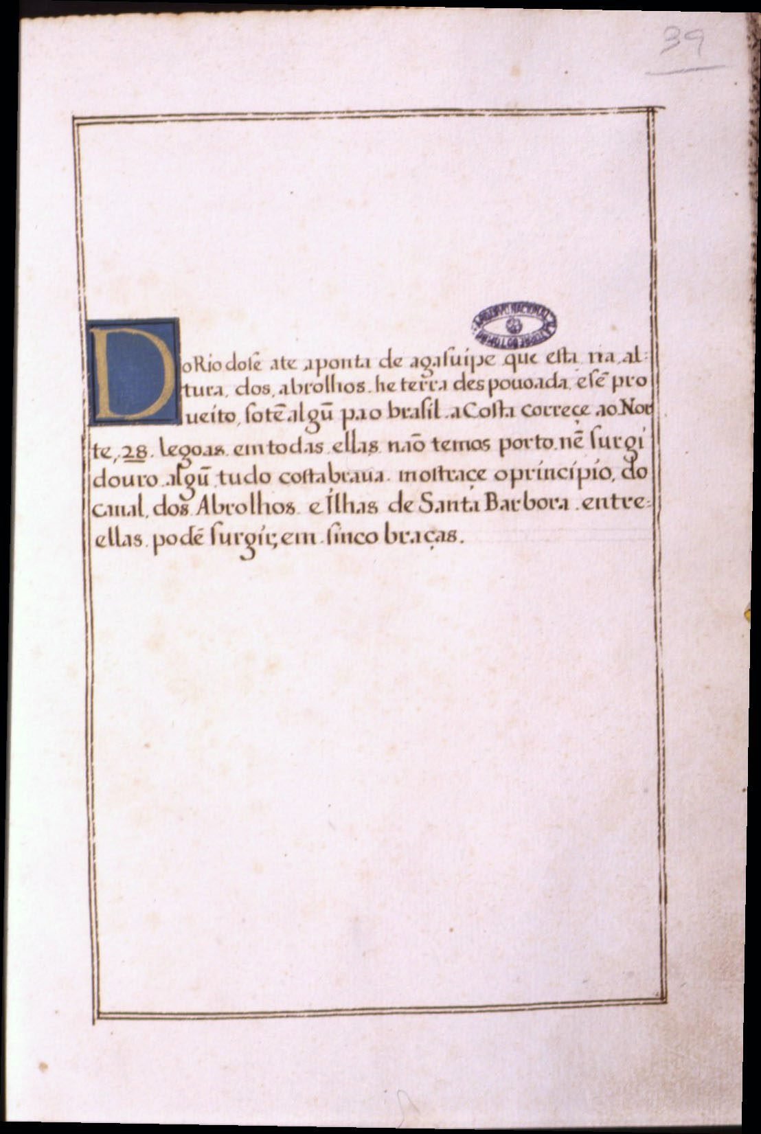 Do rio dose ate a ponta de agasuipe que esta na algura dos abrolhos. he terra despouoada, e sem proueito, so tem algum pao brasil. a Costa correçe ao Norte, 28 legoas em todas elas naõ temos porto. nem surgidouro algum tudo costa braua. mostraçe o princípio do Canal dos Abrolhos. e Ilhas de Santa Barbora. entre ellas podem surgir, em sinco braças.