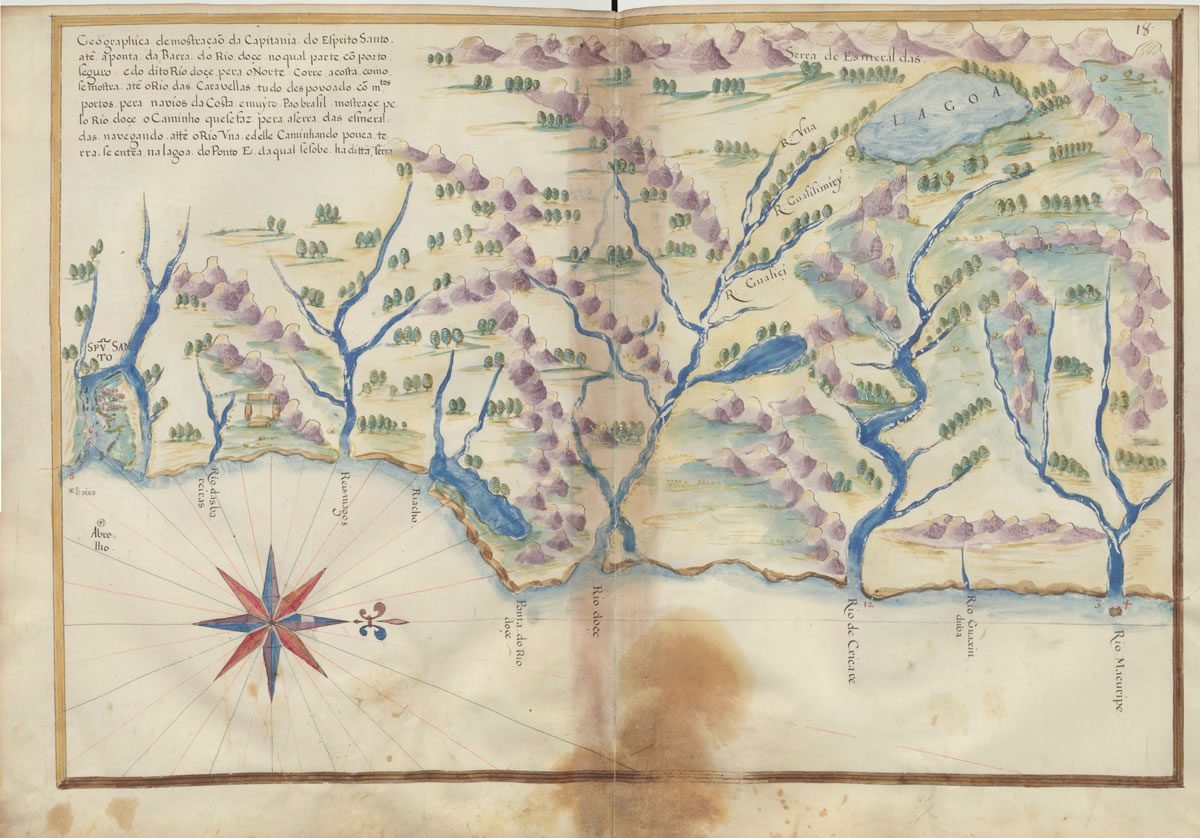Geographica demõstração da Capitania do Espirito Santo até a ponta da Barra do rio doçe no qual parte cõ Porto Seguro... [Escala ca 1:420 000]. [Ca 1627]. - 1 mapa em bifólio : ms., color.; pergaminho; 41,3x58,7cm. In: Livro em que se mostra a descripção de toda a costa do Estado do Brasil e sevs portos barras e sondas delas. Feito Por Ioão teixeira Albernas, moõ da camara de Sua Magestade e seu cosmographo. Em lixboa, Anno de 1627. - Fol. 18. - João Teixeira Albernaz, o Velho. - Pert.: Bibliothèque Nationale de Paris. Disponível em: . Acesso em: .
