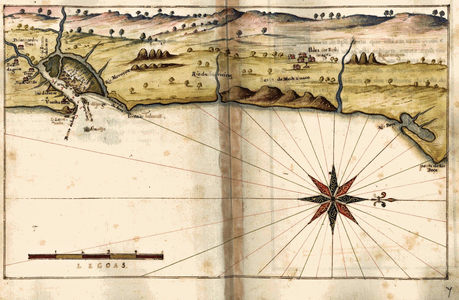 Do Porto do Spirito Santo que está em uinte graos e hum quarto uem a Costa ao Norte, e torna alguma couza da quarta do Nordeste. atte a ponta a que chamaõ do rio doçe em toda esta Costa naõ temos outro Porto nem surgidouro; he este Porto hum dos milhores da Costa do Brasil. a terra fertil, e de bõns ares. tem alguuns engenhos de asucar e matos de Pao brasil.