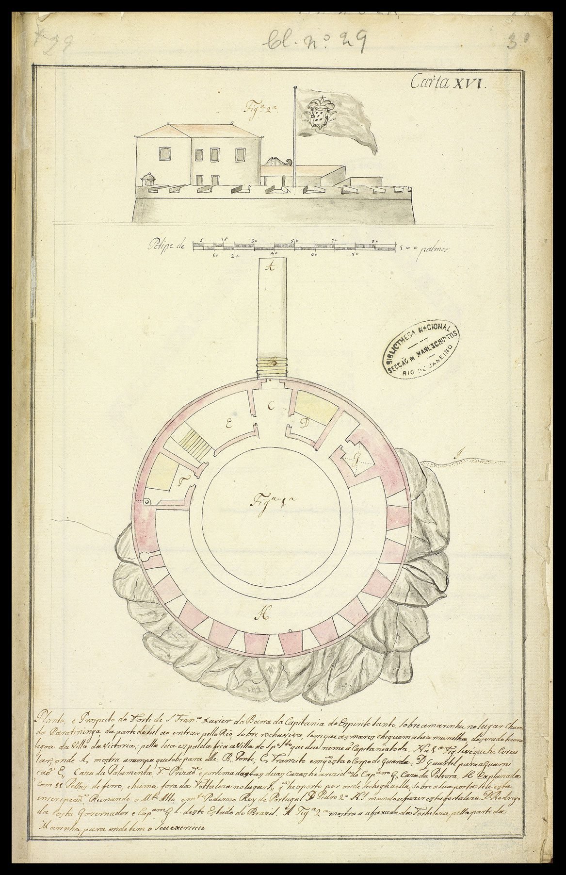 Planta e Prospecto do Forte de S. Fran.co Xavier da Barra da Capitania do Espirito Santo sobre a marinha no lugar chamado Paratininga, da parte do Sul ao entrar pello Rio, sobre a rocha viva, sem que os mares cheguem a sua muralha, Separado huma legoa da Villa da Vitoria, pella sua espalda [de encosto por detrás] fica a Villa do Sp.o S.to que deu nome a Capitania toda. Na 1ª Figa se ve que he circular, onde A., mostra a rampa que sobe para elle. B., Ponte, C,, Transito em q.e esta o Corpo de Guarda., D quartel para a guarnição E,, Caza da Palamenta. F Prisão e por sima dellas duas casas he a rezid.a do Cap.am G,, Casa de Polvora, H Explanada com 11 Pessas de ferro, e huma fora da Fortalesa no lugar I, q.e he o porto por onde se chega a ella, sobre a sua porta se le esta inscripção Reinando o Mt.o Alto, … Poderoso Rey de Portugal D. pedro 2º A. I. mandou a fazer esta fortaleza Rodrigo da Costa Governador e Cap.am G.l deste Estado do Brazil. A Fig.a aª mostra a faxada da Fortaleza pella parte da Marinha para onde tem o seu exercicio.