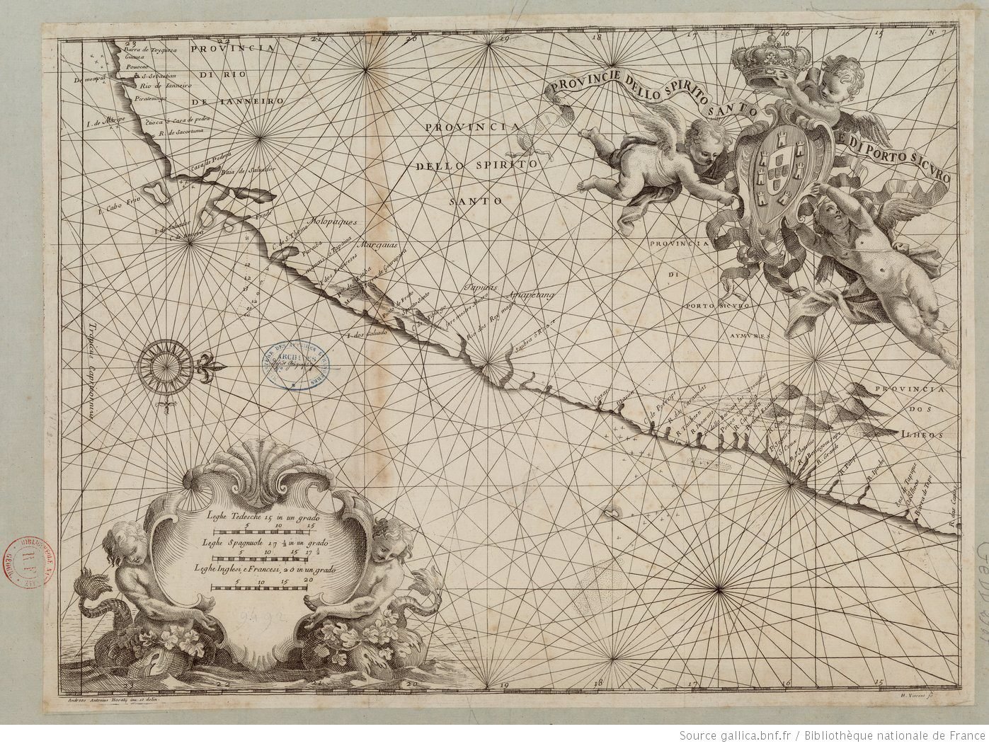 Este mapa impressionante cobre a costa do Rio de Janeiro até aproximadamente Ilhéus, na Bahia. Foi um dos 23 mapas desse raro relato da guerra colonial entre portugueses e holandeses no século XVII. Escrito por João José de Santa Teresa, e conhecida entre os bibliófilos como Santa Teresa, é considerada uma das mais suntuosas obras do século XVII no Brasil, em parte devido aos mapas incríveis. Santa Teresa, um carmelita português, passou doze anos nas missões jesuítas da América do Sul e depois retornou à Europa, onde tornou-se bibliotecário do colégio dos jesuítas em Roma. Sua conta foi fortemente subsidiada por Pedro II de Portugal, e alguns dos principais artistas e gravadores do período, incluindo Antonio Horácio Andreas, estavam empenhados em trabalhar no projeto. Foi publicado por Giacomo Giovanni Rossi. O mapa em si é lindamente desenhado e oferece uma excelente visão da região com baías, rios e riachos cuidadosamente delineados. Mesmo os riscos da navegação são mostrados ao longo do litoral. Uma grande rosa-dos-ventos orienta o mapa com o norte à direita. O mapa é elaboradamente adornado com anjos apoiando o cartucho do título e brasão real, e tritões apoiando o cartucho de escalas de distância em forma de concha.