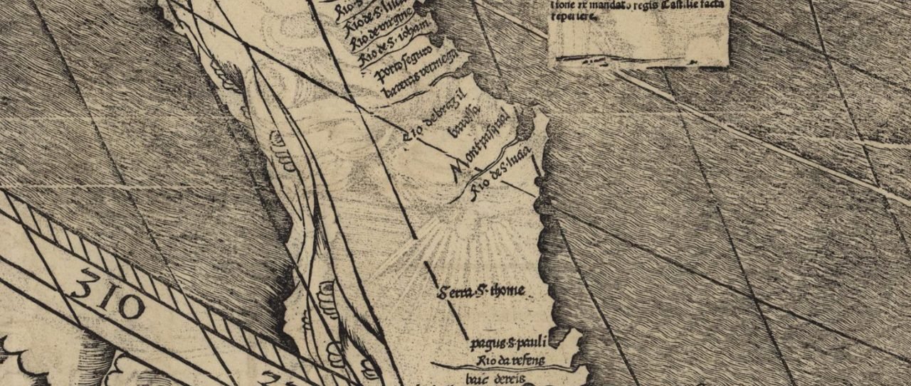 WALDSEEMÜLLER, Martin. Universalis cosmographia secundum Ptholomaei traditionem et Americi Vespucii alioru[m]que lustrationes. 1507. 1 mapa: impresso em 12 folhas, pb.; 128 x 233 cm. Disponível em: . Acesso em: .