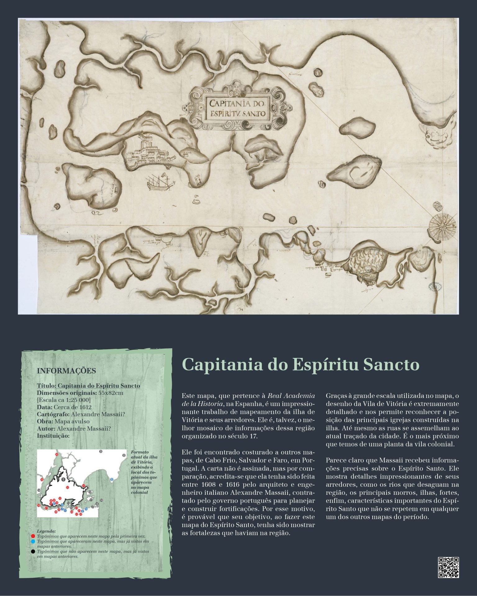 Este mapa, que pertence à Real Academia de la Historia, na Espanha, é um impressionante trabalho de mapeamento da ilha de Vitória e seus arredores. Ele é, talvez, o melhor mosaico de informações dessa região organizado no século 17.