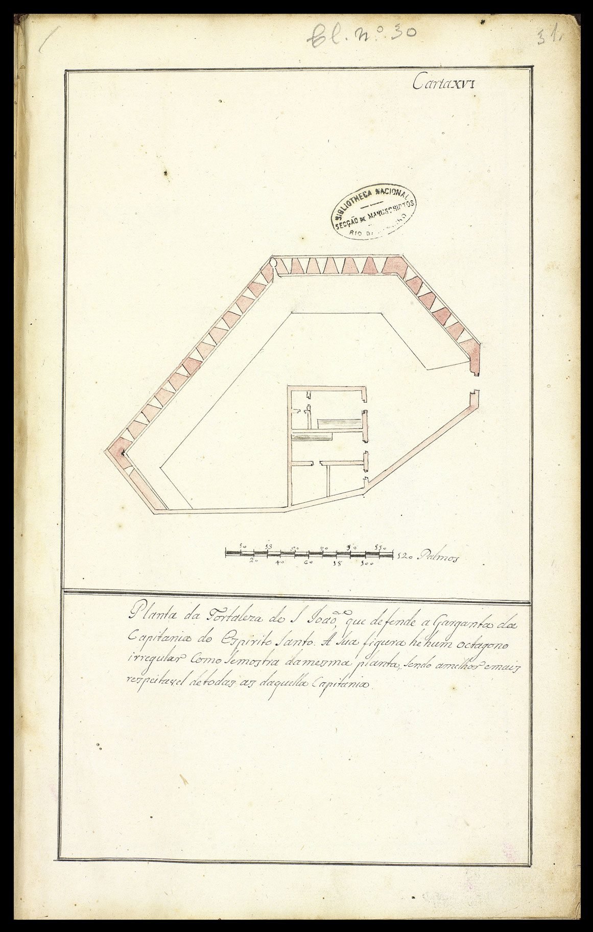 Planta da Fortaleza do S. João, que defende a garganta da Capitanai do Espirito Santo. A sua figura he hum octagono irregular Como se mostra da mesma planta, sendo a melhor e mais respeitavel de todas as daquella Capitania.